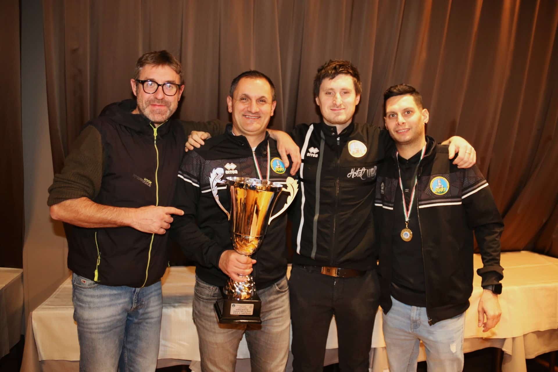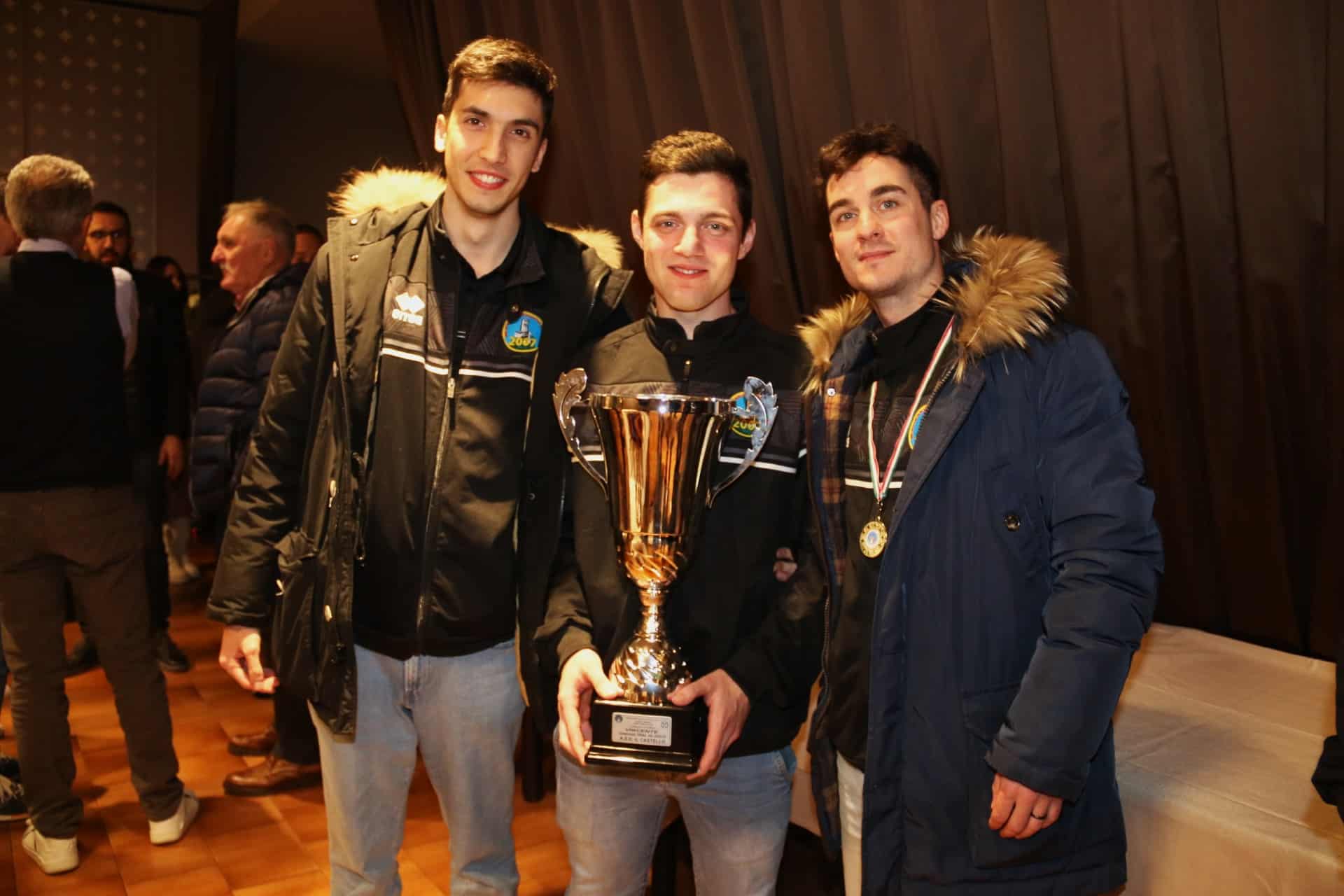 La coppa di vincitore della Terza Categoria 2023 è stata finalmente consegnata al Castello. La formazione gemonese, infatti, non era stata premiata sul campo, come accaduto al vincitore del Campionato Cavazzo e alla Stella Azzurra (regina della Seconda), avendo i rosanero conquistato la matematica certezza del primato all’ultima giornata, quando osservava il turno di riposo. Così la Federazione ha effettuato la premiazioneo nel corso di una cerimonia in un locale di Gemona, presenti il vicepresidente regionale Fabrizio Chiarvesio, il Delegato Lnd di Tolmezzo Maurizio Plazzotta, il componente della Delegazione Gino Candido, il presidente della sezione AIA di Tolmezzo Fabrizio Marchetti e l’assessore comunale Fabrizio Venturini.