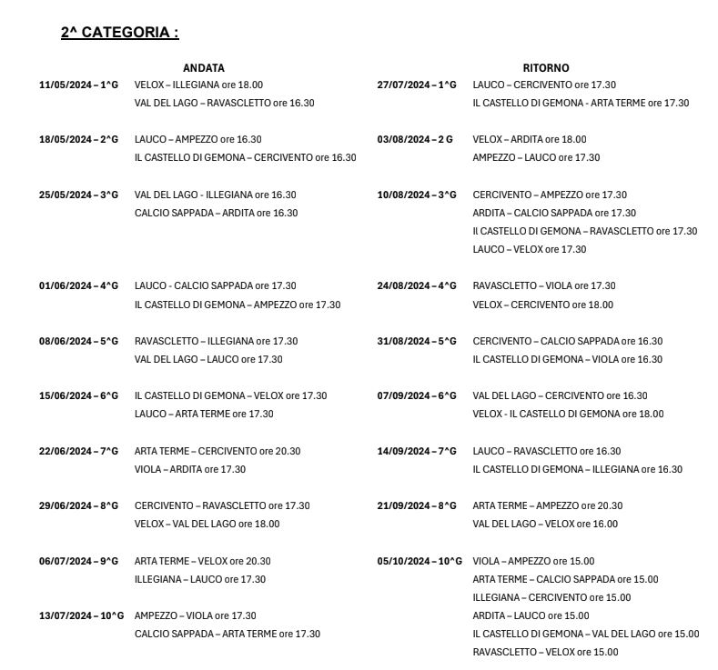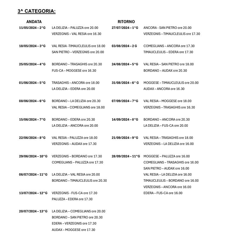 La federazione ha reso noto gli anticipi del Carnico 2024 per l’intero campionato. Lo stesso accadde lo scorso anno, ad eccezione della Terza Categoria, visto che ovviamente non si conoscevano le partite della seconda fase e quindi ad inizio torneo erano stati resi noti gli anticipi solo del girone unico.