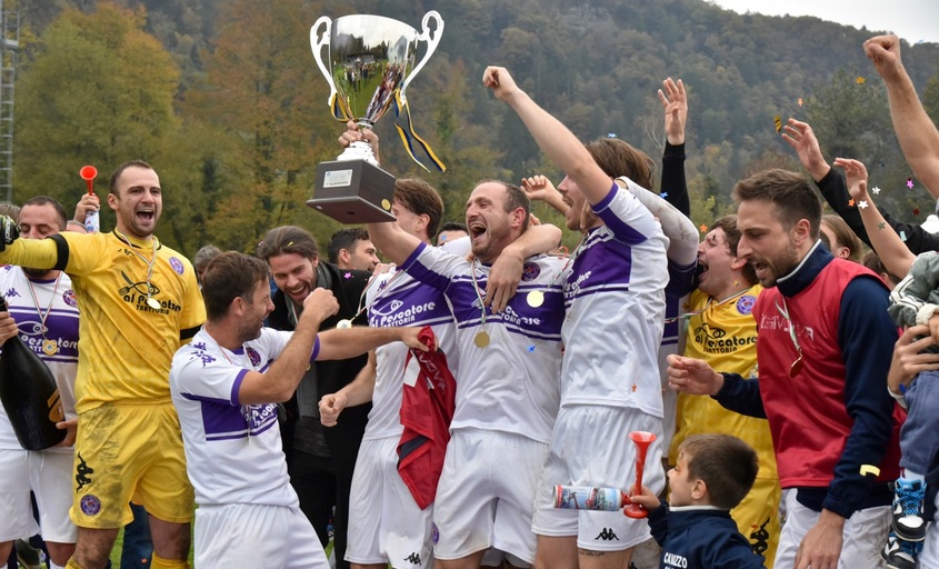 Proponiamo le immagini dell’immediato post partita di Cavazzo-Illegiana, con la festa viola per lo scudetto e la premiazione (foto di copertina di Alberto Cella).